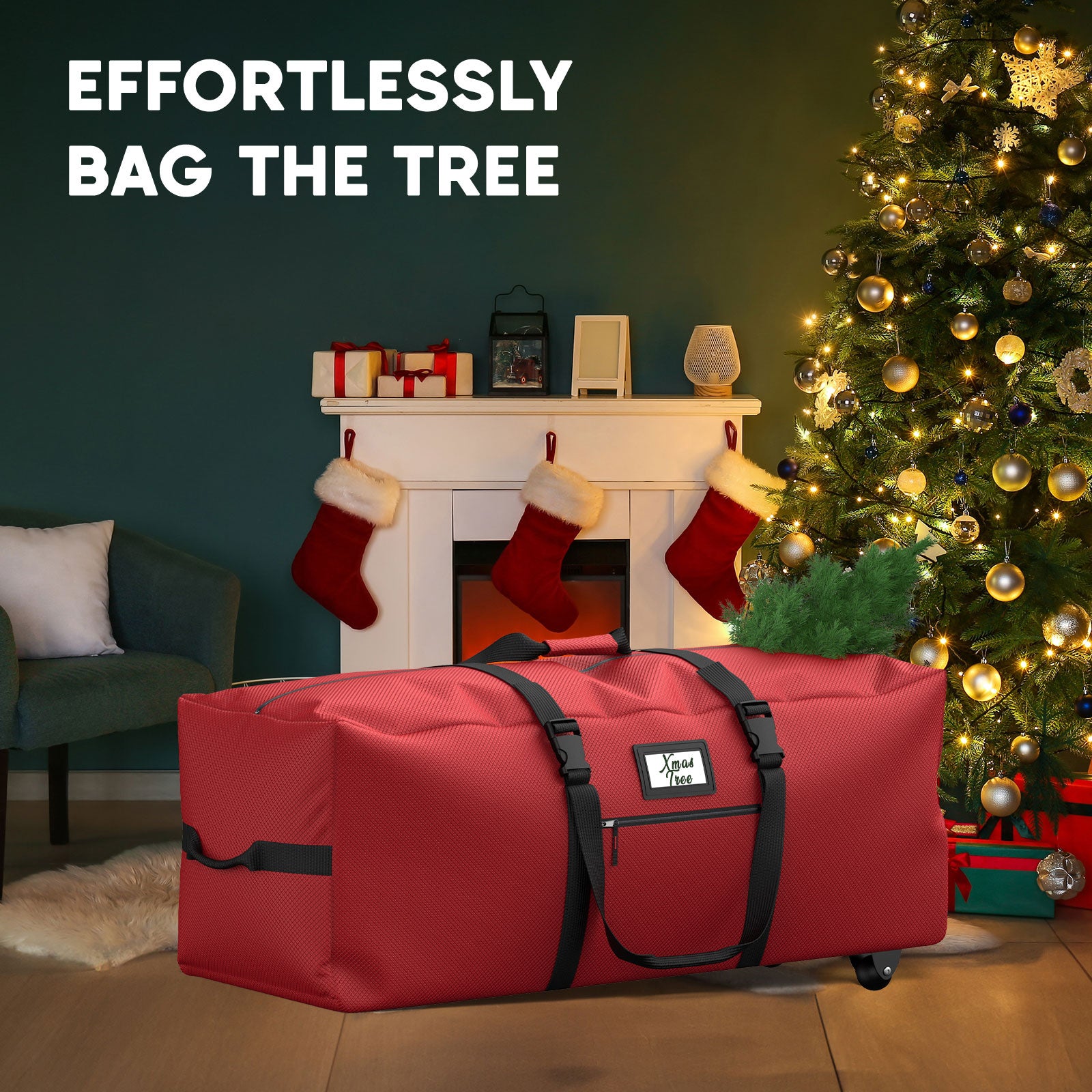 - Sturdy Tree Storage Fabric: Christmas tree storage bags with wheels are made of sturdy tear-proof and waterproof 600D oxford polyester. High quality double zipper closure makes it easier to open the organizer bag.Carrying handle is reinforced with double stitching for more comfortable and convenient carrying
