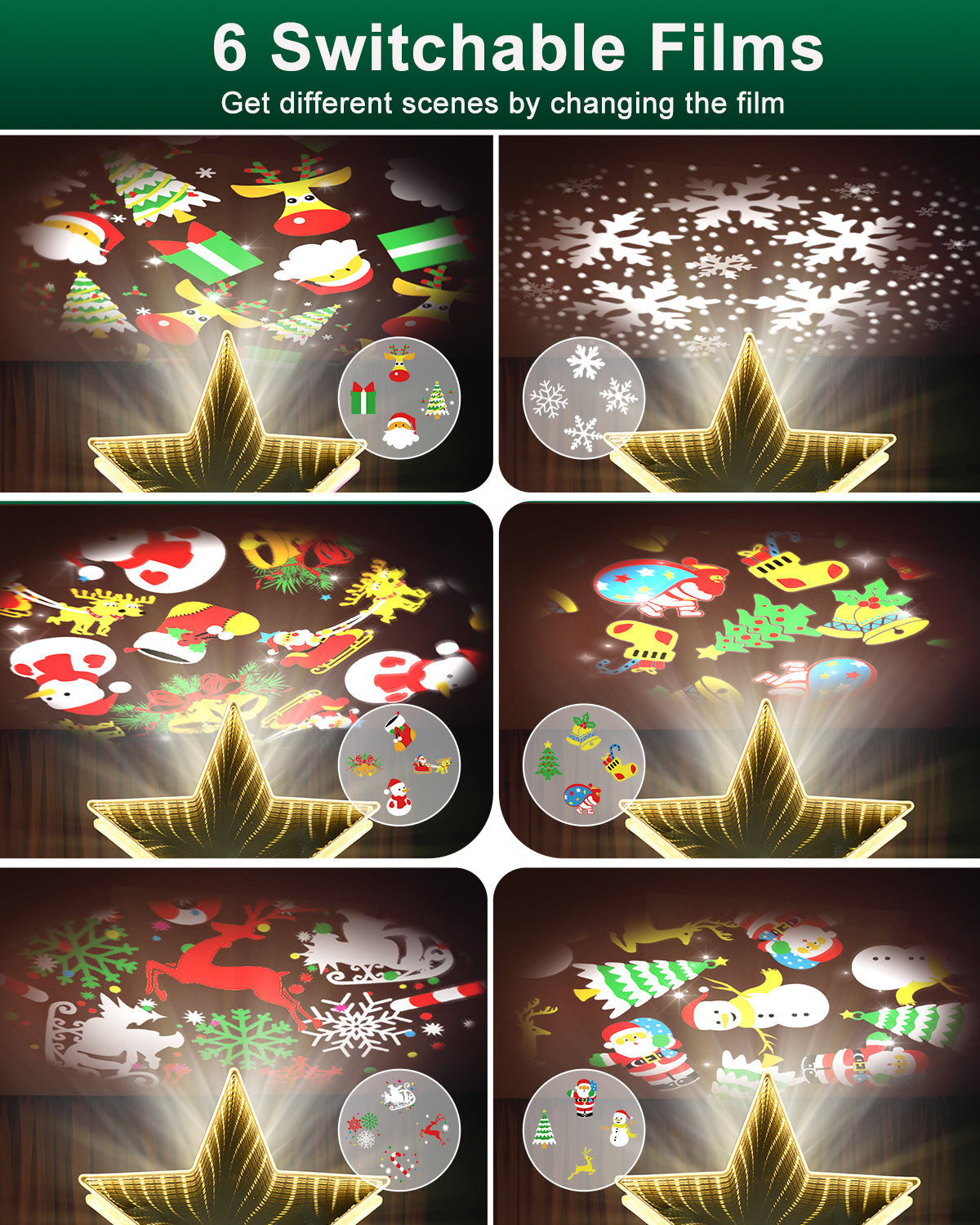- 6 Switchable Projections Modes: Christmas star tree topper with lights get different scenes by changing films, six projection patterns: Snowflakes, Christmas tree, Christmas stockings, Elk, Snowman, Santa Claus, dynamic patterns on your ceiling to present a wonderful light show