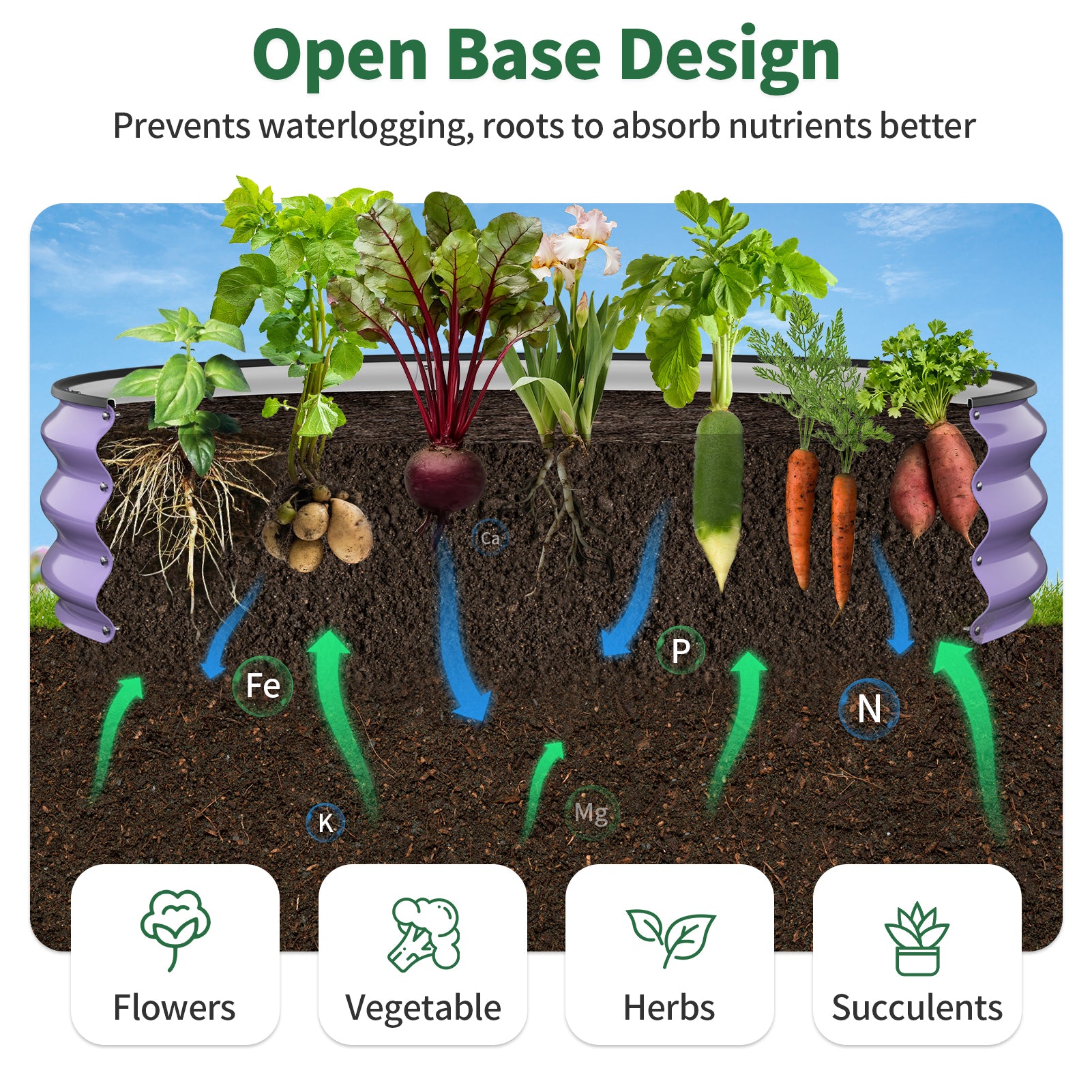 Made from galvanized steel with a fade-resistant, rust-resistant coating, it’s built for reliable outdoor use. The open-bottom design allows excess water to drain naturally while letting roots extend into native soil for improved drainage and soil balance.